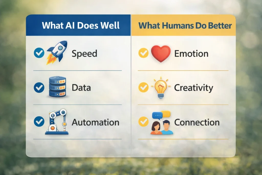 AI creates content efficiently, focusing on speed and volume. Humans bring meaning and emotional connection, which turn content into stories that matter.